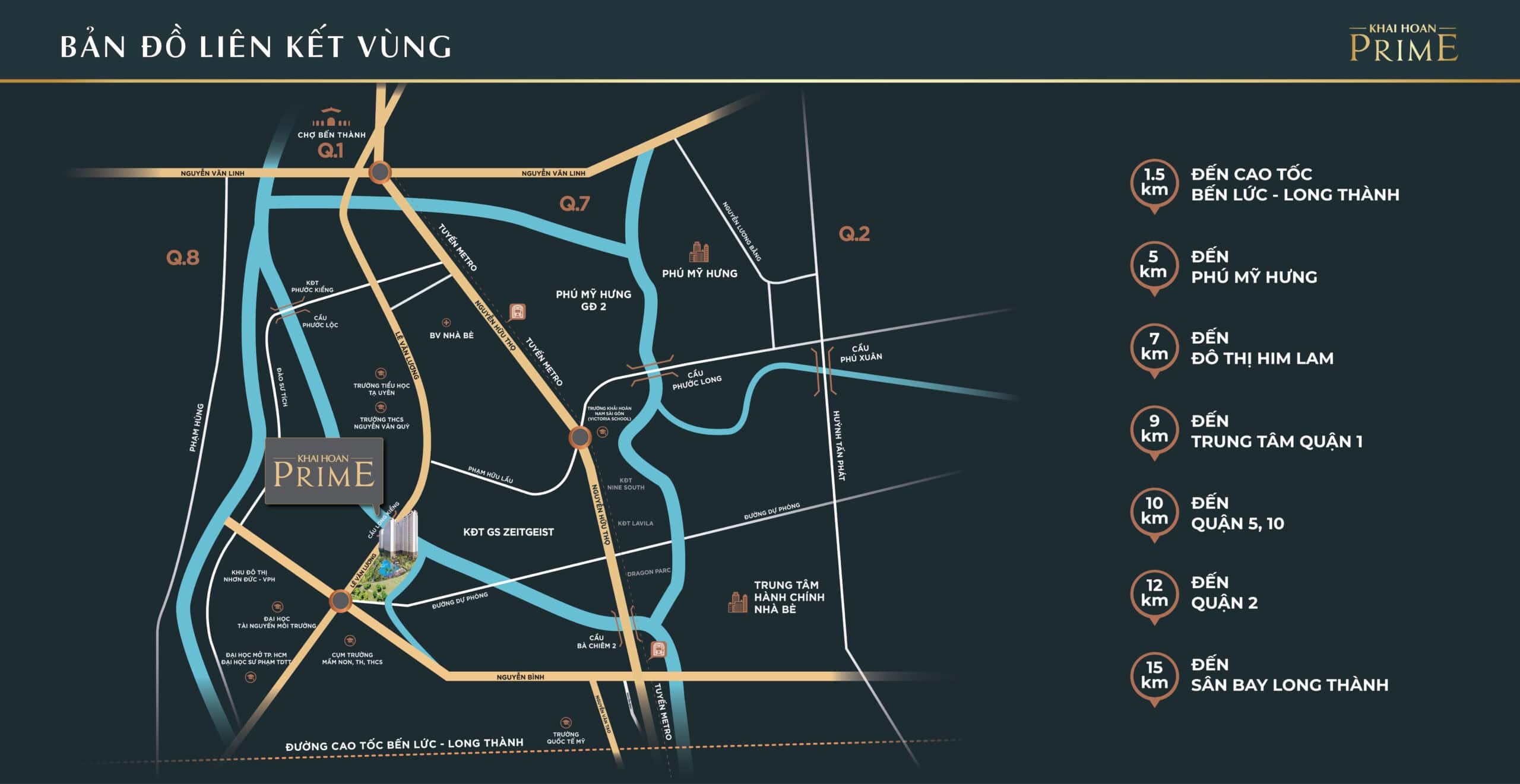 Dự án tọa lạc trên đường Lê Văn Lương, trục giao thông huyết mạch kết nối Nhà Bè với Quận 7 – Phú Mỹ Hưng và trung tâm TP.HCM. Từ Khải Hoàn Prime, cư dân có thể dễ dàng di chuyển đến: